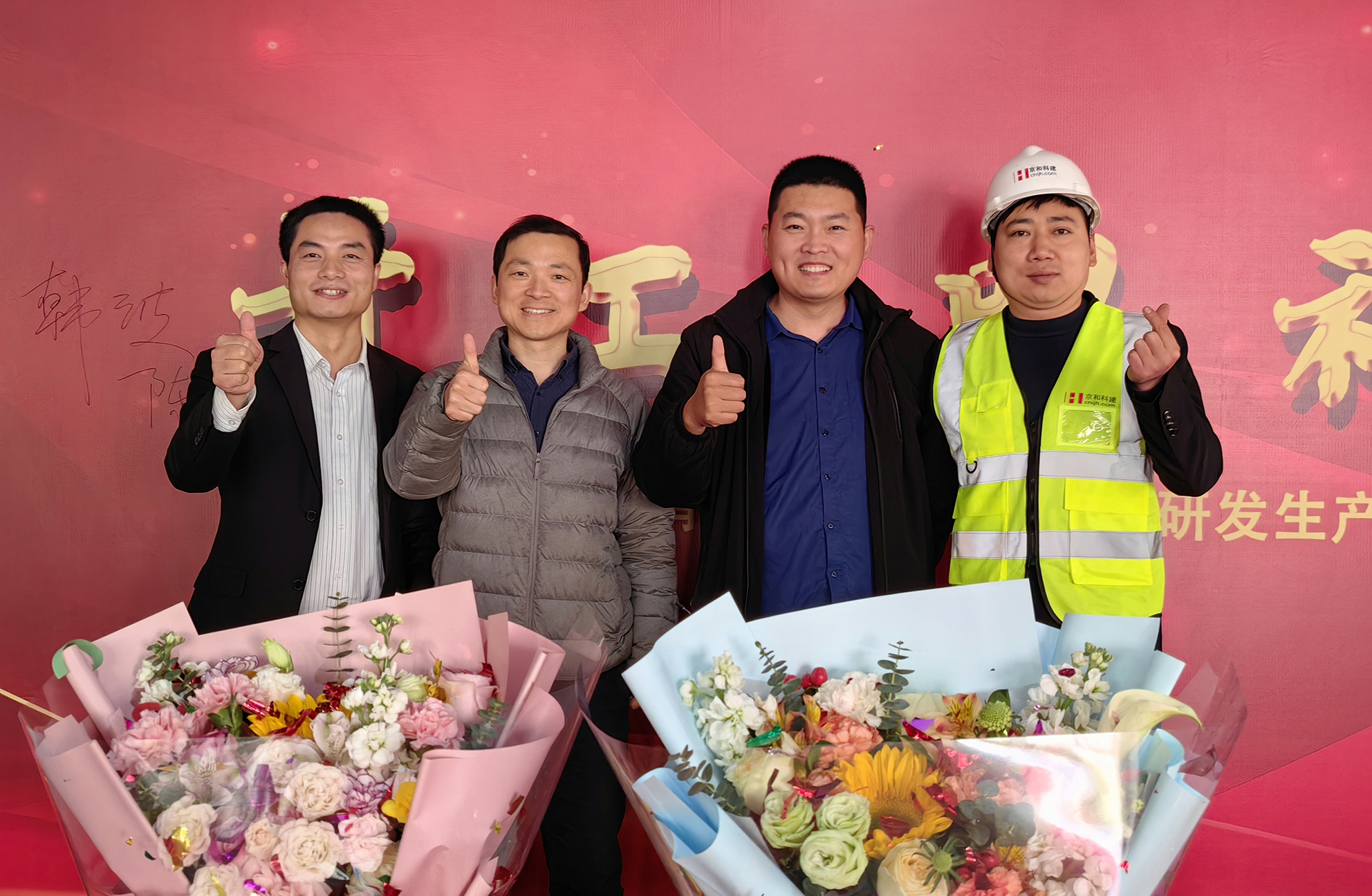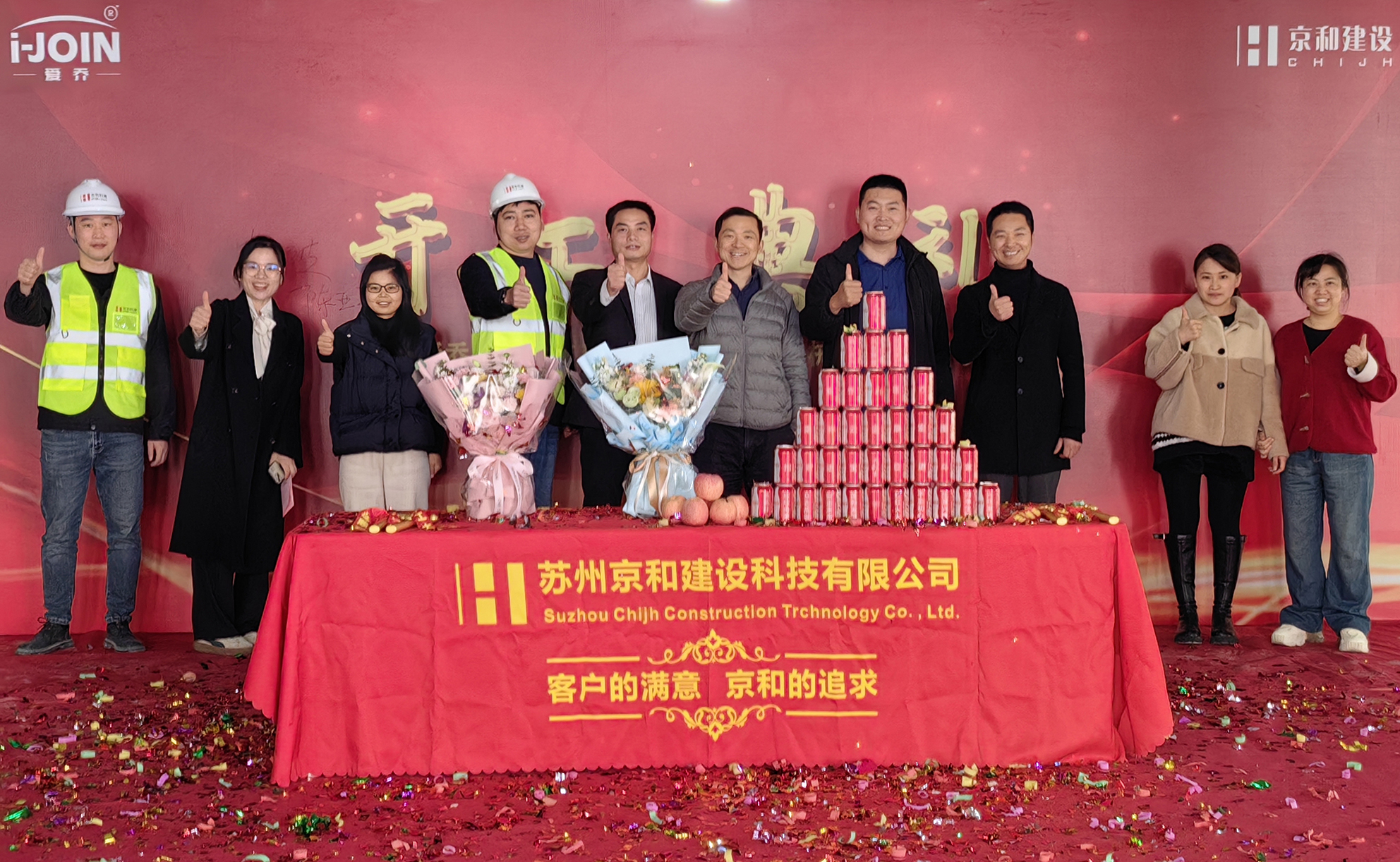 建設單位蘇州愛喬醫(yī)療科技有限公司韓波經(jīng)理、陳亞平經(jīng)理,以及本次項目施工總包方蘇州京和建設科技有限公司領導余贊、袁沖及部門其他員工一同參加了典禮。